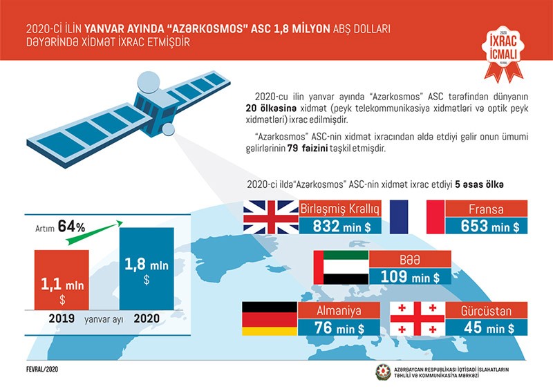 2020-cu ilin yanvar ayında “Azərkosmos” ASC tərəfindən dünyanın 20 ölkəsinə 1,8 milyon ABŞ dolları dəyərində xidmət (peyk telekommunikasiya xidmətləri və optik peyk xidmətləri) ixrac edilib.