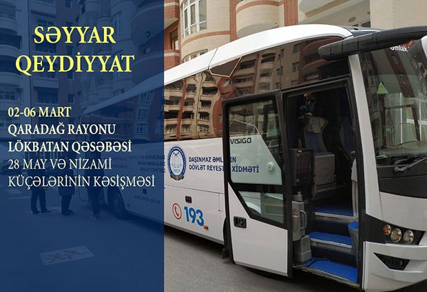 Səyyar xidmət 2-6 mart tarixlərində Qaradağ rayonu, Lökbatan qəsəbəsində təşkil ediləcək. Sakinlərin xidmətdən çevik və rahat istifadəsinə imkan yaradan mobil qeydiyyat ofisi Lökbatan qəsəbəsi, 28 May və Nizami küçələrinin kəsişməsində (125 N-li avtobusun son dayanacağı) olacaq.