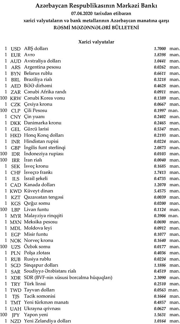 2020-ci ilin Aprel ayının 7-nə Mərkəzi Bankın açıqladığı rəsmi Dollar/Manat məzənnəsi Aprelin 6-sı ilə müqayisədə dəyişməyərək 1,7000 manatda qalıb, Avro/manat məzənnəsi 1.8398 manata düşüb, Rubl/manat məzənnəsi isə 0,0224 manatda qalıb.