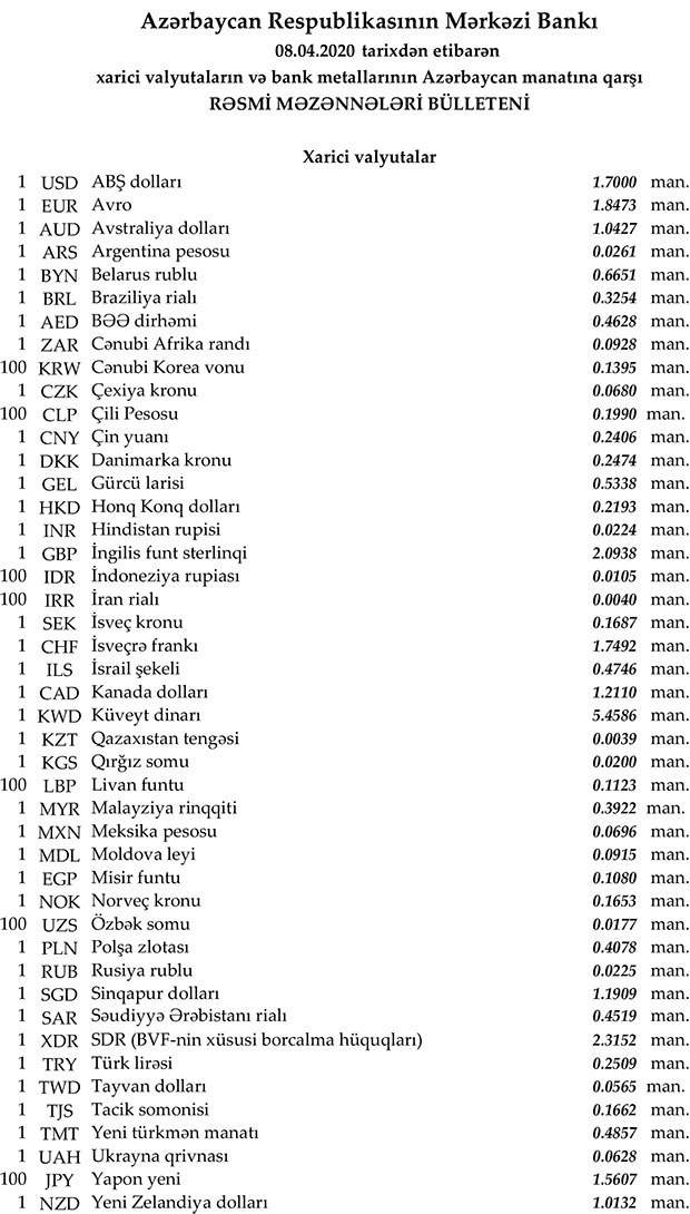 2020-ci ilin Aprel ayının 8-nə Mərkəzi Bankın açıqladığı rəsmi Dollar/Manat məzənnəsi Aprelin 7-si ilə müqayisədə dəyişməyərək 1,7000 manatda qalıb, Avro/manat məzənnəsi 1.8473 manata, Rubl/manat məzənnəsi isə 0,0225 manata qalxıb