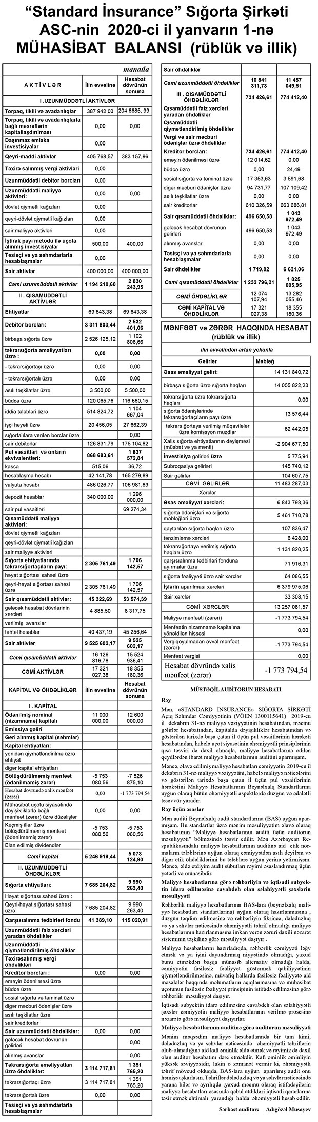 Marja Şirkətin maliyyə hesabatlarına istinadən xəbər verir ki, ötən il “Standard İnsurance”ın cəmi gəlirləri 11 milyon 483 min manat, cəmi xərcləri isə 13 milyon 257 min manat təşkil edib. Şirkətin xərcləri gəlirlərini üstələdiyindən 1 milyon 774 min manat zərər yaranıb.
