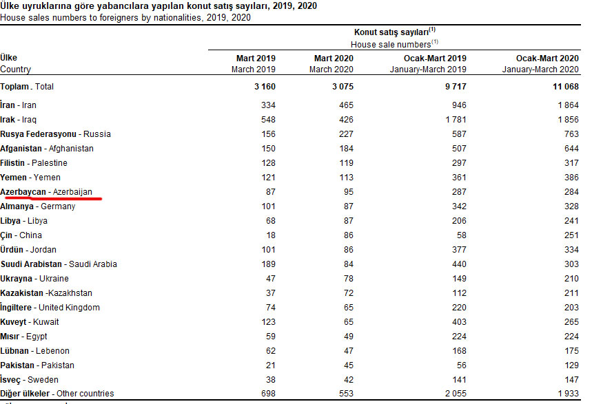 2020-ci ilin ilk 3 ayında Türkiyədən ən çox mənzili İran (1864), İraq (1856) və Rusiya (763) vətəndaşları alıblar.