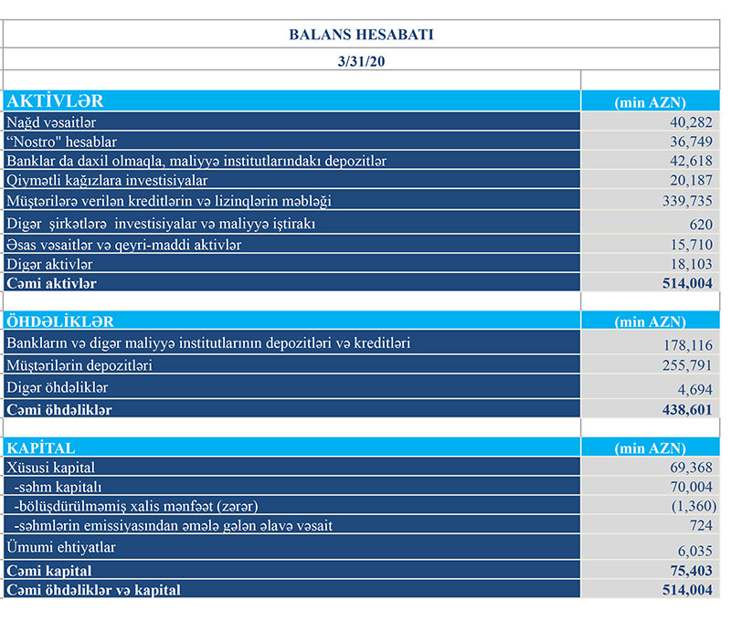 31 Mart 2020-ci il tarixində Turanbank 514 milyon 4 min manat cəmi aktivlərə malik olub, o cümlədən aktivlərin 339 milyon 735 min manatını müştərilərə verilən kreditlər təşkil edib. Müqayisə üçün qeyd edək ki, 2019-cu ilin sonunda Bank 489 milyon 538 min manat cəmi aktivlərə malik idi və aktivlərin 340 milyon 233 min manatını müştərilərə verilən kreditlər təşkil etmişdi.