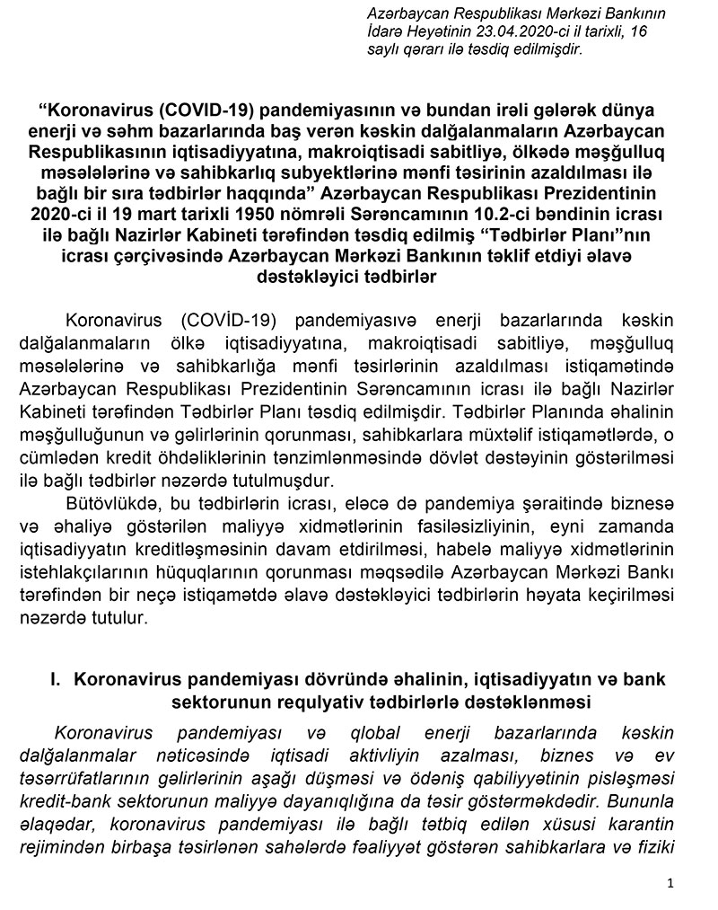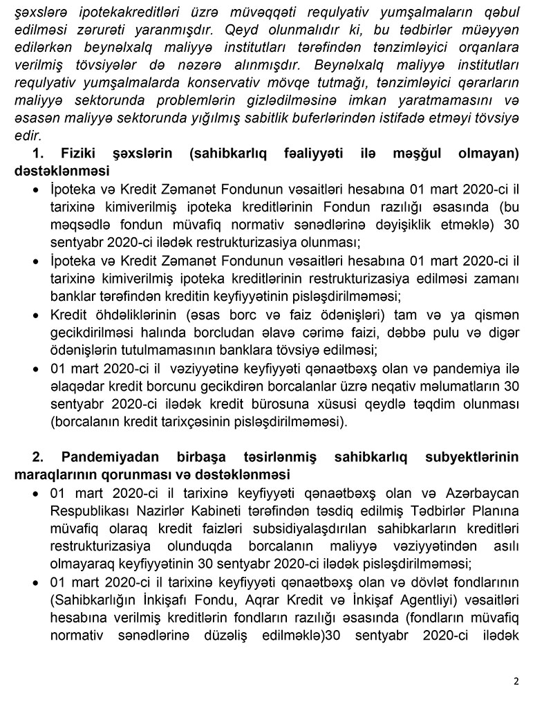Azərbaycan Respublikası Prezidentinin “Koronavirus (COVID-19) pandemiyasının və bundan irəli gələrək dünya enerji və səhm bazarlarında baş verən kəskin dalğalanmaların Azərbaycan Respublikasının iqtisadiyyatına, makroiqtisadi sabitliyə, ölkədə məşğulluq məsələlərinə və sahibkarlıq subyektlərinə mənfi təsirinin azaldılması ilə bağlı bir sıra tədbirlər haqqında” 19 mart 2020-ci il tarixli 1950 nömrəli Sərəncamının 10.2-ci bəndinin icrası ilə bağlı Nazirlər Kabineti tərəfindən təsdiq edilmiş “Tədbirlər Planı”nın “Karantin rejimi müddətində pandemiyadan zərər çəkmiş sahələrdə fəaliyyət göstərən sahibkarların öhdəliklərinin tənzimlənməsi məqsədilə kredit təşkilatlarına requlyativ tətilin verilməsi” tədbirinin icrası çərçivəsində Azərbaycan Mərkəzi Bankı Maliyyə Sabitliyi Şurasının tövsiyələrini nəzərə almaqla müvafiq qərar qəbul etmişdir.