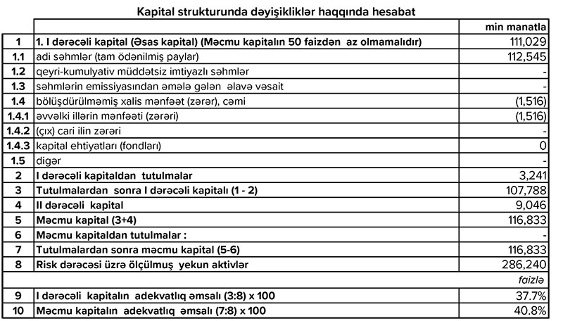 2020-ci ilin I rübün göstəricilərinə əsasən Expressbank ASC Mərkəzi Bank tərəfindən müəyyən olunmuş bütün prudensial normativləri də yüksək səviyyədə yerinə yetirmişdir. Belə ki, 31 mart 2020-ci il tarixində Bankın I dərəcəli kapitalın adekvatlıq əmsalı 38%, məcmu kapital adekvatlığı 40.8%, leverec əmsalı isə 29% təşkil etmişdir. Yəni hesabat dövrünü, bankın tutulmalarından sonra I dərəcəli kapitalı 107.8 milyon manat, məcmu kapitalı isə 116.8 milyon manat ilə başa vurmuşdur. Bu da, müəyyən edilmiş normativlərlərdən dəfələrlə artıq olmaqla bir daha bankın maliyyə cəhətdən sağlam və dayanıqlı olduğunu sübut edir.