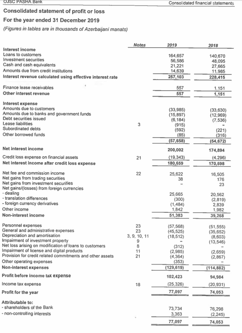 2018-ci illə müqayisədə 2019-cu ildə PAŞA Bank qrupunun faiz gəlirləri 28 milyon 688 min manat və ya 12,6% artaraq 257 milyon 103 min manata, qeyri-faiz gəlirləri isə 12 milyon 115 min manat və ya 30,8% artaraq 51 milyon 383 min manata yüksəlib. Ötən il Bankın cəmi faiz və qeyri-faiz gəlirləri 40 milyon 803 min manat artıb.
