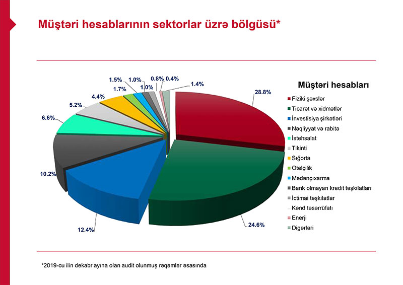 Müştəri depozitləri əsasən tələbli və müddətli hesablarda müvafiq olaraq 57% və 43 % nisbətində cəmlənmişdir (2018: 75% and 25%). Bank 2019-ci maliyyə ili üçün 77,097 min manat xalis mənfəət (2018: 74,053 min manat) elan etmişdir. Eyni dövr üçün toplam əməliyyat gəlirləri 251,385 min manat olmuşdur ki, bu göstərici keçən ilin müvafiq dövrü ilə müqayisədə 17% çoxdur (2018: 214,162 min manat). Bankın faiz gəlirləri 257,660 min manat, qeyri-faiz gəlirləri 51,383 min manat təşkil etmişdir. Nəticədə qeyri-faiz gəlirinin ümumi əməliyyat gəlirlərinə nisbəti 20% olmuşdur.