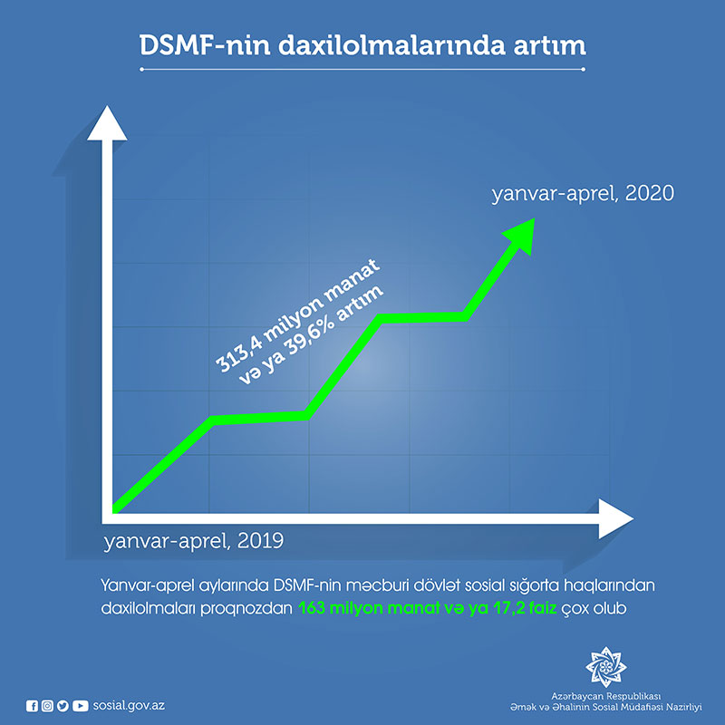 Əmək və Əhalinin Sosial Müdafiəsi Nazirliyinin yaydığı məlumatda bildirilir ki, ötən ilin müvafiq dövrü ilə müqayisə etdikdə isə, hətta xüsusi karantin rejiminə baxmayaraq, DSMF-nin daxilolmaları keçən ilin müvafiq dövrünə nisbətən 313,4 milyon manat və ya 39,6 faiz artıqdır.