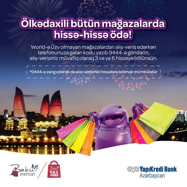 Worldcard Müştəriləri bütün mağazalarda etdikləri alış-verişləri hissələrə bölə biləcəklər. Bunun üçün alış-veriş etdikdən sonra telefonuna gələn kodu 9444-ə SMS-lə göndərmək kifayət edəcəkdir. Ətrafı məlumatı buradan almaq mümkündür.