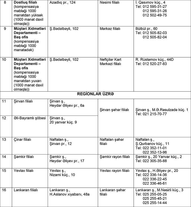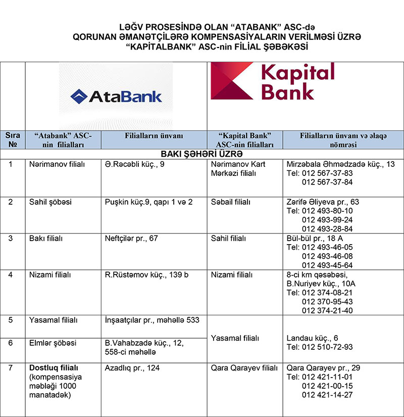Əlavə olunan cədvələ uyğun olaraq qorunan əmanətçilər ləğv prosesində olan “Atabank” ASC və “Amrahbank” ASC-də əmanətləri olduğu filialın qarşısında qeyd edilən “KapitalBank” ASC-nin filialına müraciət edərək yuxarıda qeyd edilən sənədlər əsasında kompensasiyalarını əldə edə bilərlər.