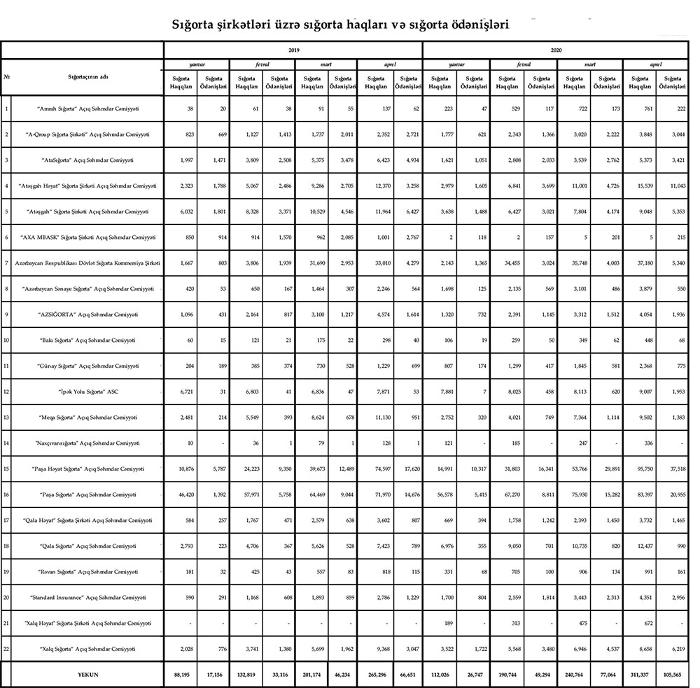 Bu ilin yanvar-aprel aylarında Azərbaycandakı 22 sığorta şirkətinin xətti ilə 331,3 milyon manat məbləğində sığorta haqqı toplanılıb.