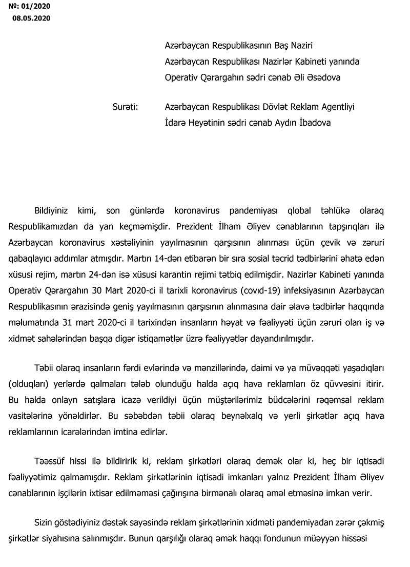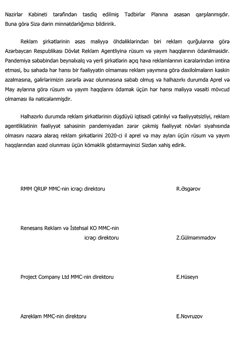 Reklam şirkətlərinin xidməti pandemiyadan zərər çəkmiş şirkətlər siyahısına salınıb. Bunun qarşılığı olaraq əmək haqqı fondunun müəyyən hissəsi Nazirlər Kabineti tərəfindən təsdiq edilmiş Tədbirlər Planına əsasən qarşılanıb. Reklam şirkətlərinin əsas maliyyə öhdəliklərindən biri reklam qurğularına görə Reklam Agentliyinə rüsum va yayım haqlarının ödənilməsidir. Pandemiya səbəbindən beynəlxalq və yerli şirkətlərin açıq hava reklamlarının icarələrindan imtina etməsi, bu sahədə hər hansı bir fəaliyyətin olmaması reklam yayımına görə daxilolmaların kəskin azalmasına, gəlirlərimizin zərərlə əvəz olunmasına səbəb olub va hazırkı durumda aprel və may aylarına görə rüsum və yayım haqlarını ödəmək üçün hər hansı maliyyə vəsaiti mövcud olmaması ilə nəticələnib”.