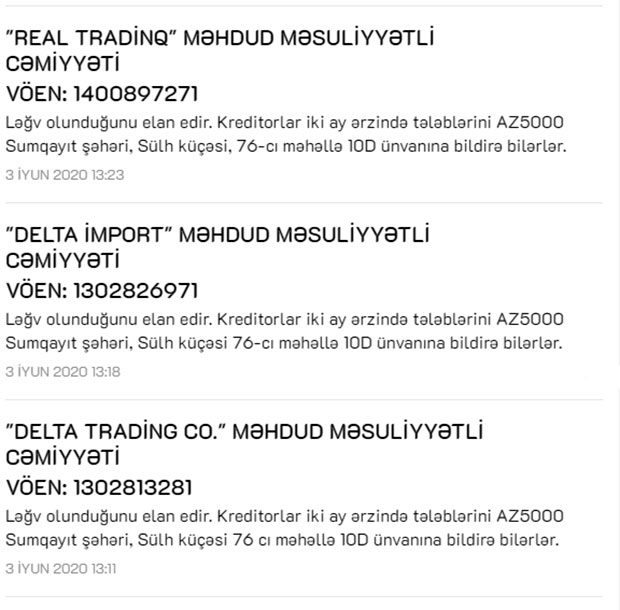 "Delta Qrup C.O." şirkətlər qrupu iyunun 3-də icarət və malların idxalı ilə məşğul olan üç törəmə şirkətinin ləğv olunduğunu elan edib.
