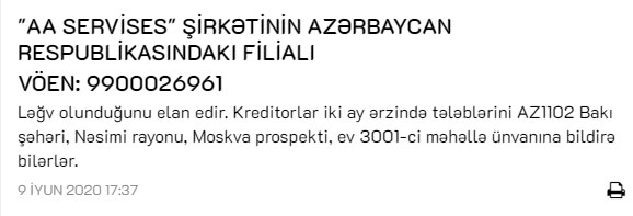 Marja xəbər verir ki, "AA Services" şirkətinin Azərbaycan Respublikasındakı filialı ləğv olunduğunu elan edir.