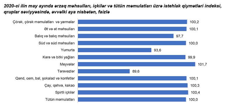 2020-ci ilin may ayında ərzaq məhsulları, içkilər və tütün məmulatları üzrə istehlak qiymətləri indeksi əvvəlki aya nisbətən 1,3 faiz azalmış, əvvəlki ilin may ayına nisbətən 5,7 faiz artmışdır.