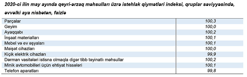 2020-ci ilin may ayında qeyri-ərzaq məhsulları üzrə istehlak qiymətləri indeksi əvvəlki aya nisbətən 0,1 faiz, əvvəlki ilin may ayına nisbətən 1,4 faiz artıb.