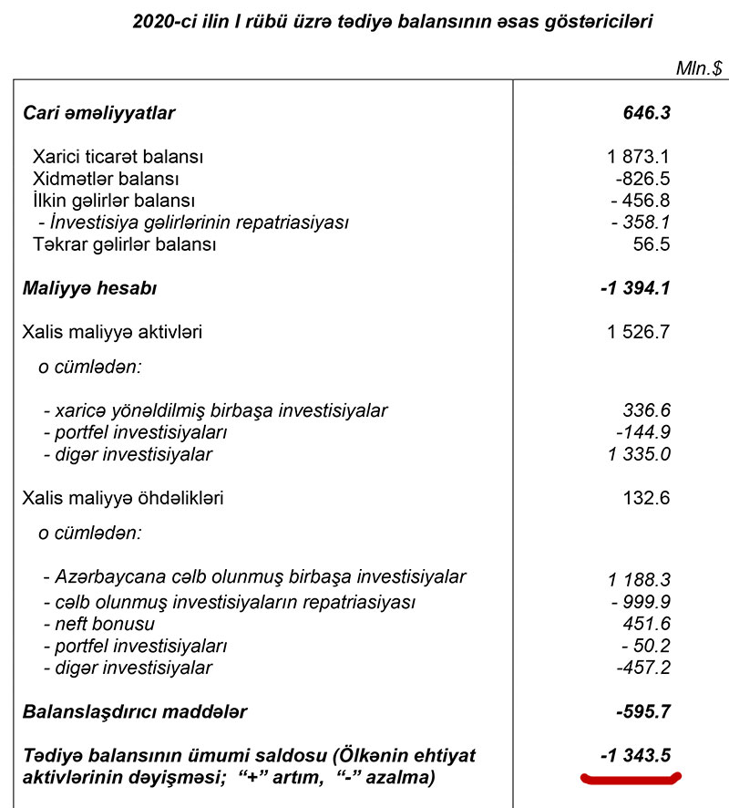 2020-ci ilin 1-ci rübü üzrə Azərbaycan Respublikasının tədiyyə balansında bildirilir ki, xarici mühitin əlverişsiz olduğu bir şəraitdə 2020-ci ilin 1-ci rübü üzrə tədiyə balansının əsas maddələri olan cari əməliyyatlar balansında (CƏB) 646 milyon dollar profisit, kapital və maliyyənin hərəkəti hesabında isə 1.4 milyard kəsir yaranmış, ehtiyat aktivləri 1.3 milyard azalmışdır. Bu dövrdə orta rüblük neft qiyməti 58 dollar/barel olmuş, qeyri-neft ixracı isə 4% artmışdır.
