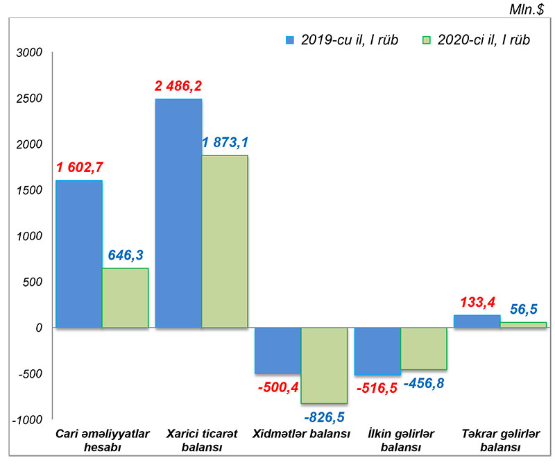2020-ci ilin 1-ci rübü üzrə cari əməliyyatlar hesabının profisiti ötən ilin müvafiq dövrünə nəzərən (ö.i.m.d.n.) 2.5 dəfə azalaraq 646.3 milyon dollar təşkil etmişdir. Neft-qaz sektoru üzrə CƏB profisiti ö.i.m.d.n. 19.2% (0.6 milyard dollar) azalaraq 2.4 milyard dollar, qeyri-neft sektoru üzrə CƏB kəsiri isə 28.4% (0.4 milyard dollar) artaraq 1.8 milyard dollar məbləğində olmuşdur. Nəticədə cari əməliyyatlar hesabında neft-qaz sektorunun profisiti qeyri-neft sektorunun kəsirini tam örtmüşdür. CƏB profisiti əsasən xarici ticarət balansının profisiti hesabına formalaşmışdır.