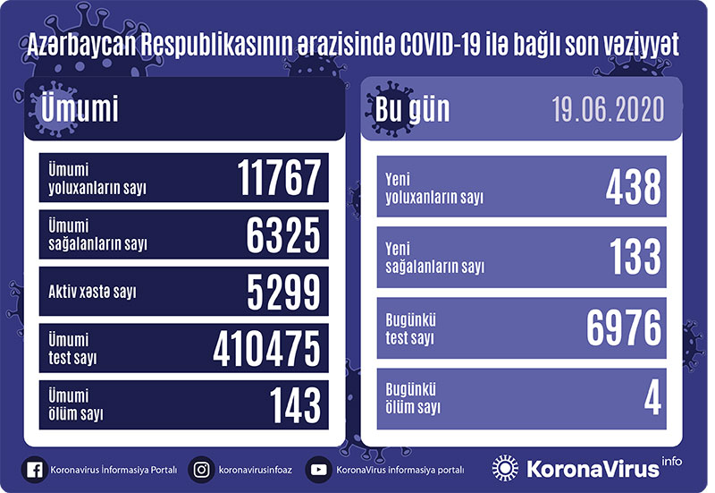 Son 24 saatda Azərbaycan Respublikasında koronavirus (COVID-19) infeksiyasına 438 yeni yoluxma faktı qeydə alınıb, 133 nəfər müalicə olunaraq sağalıb və evə buraxılıb.