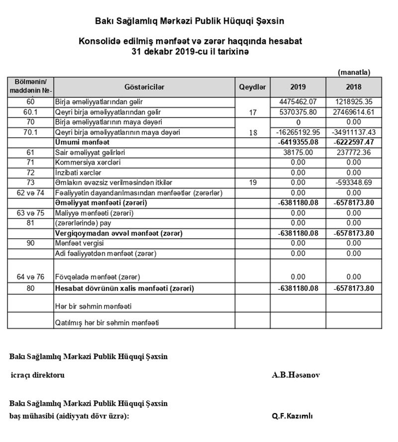 3 ildə cəmi zərər 17 milyon 793 min manat təşkil edirBakı Sağlamlıq Mərkəzi Publik Hüquqi Şəxsi 2019-cu ili 6 milyon 381 min manat xalis zərər ilə başa vurub. Mərkəz 2018-ci ili 6 milyon 578 min manat zərər ilə bağlamışdı. Beləliklə, ötən il Mərkəzin zərəri cüzi azalıb.