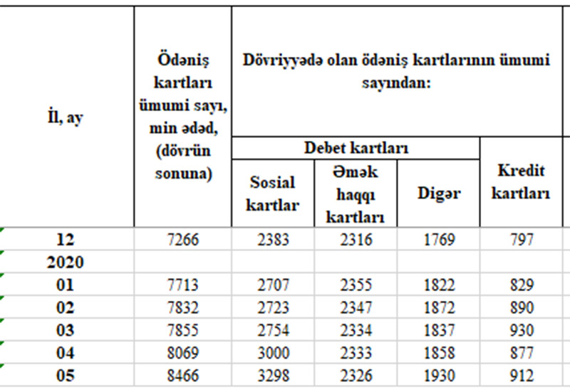 2020-ci ilin Yanvar ayının sonunda 2 milyon 355 min ədədə çatan əməkhaqqı kartları sonrakı aylar 29 ədəd azalaraq Mayın sonunda 2 milyon 326 min ədədə düşüb.