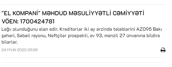 Marja xəbər verir ki, "EL Kompani" MMC ləğv olunduğunu elan edib. Kreditorlar iki ay ərzində tələblərini AZ095 Bakı şəhəri, Səbail rayonu, Neftçilər prospekti, ev 93, mənzil 27 ünvanına bildirə bilərlər.