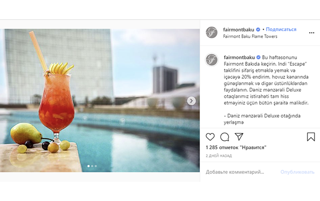 "Fairmont Baku"un karantin rejimini pozması ilə bağlı xəbər yayıldıqdan sonra, hotel paytaxt sakinlərinə həftəsonu istirahəti ilə bağlı etdiyi çağırışı şəxsi instaqram hesabından silib.