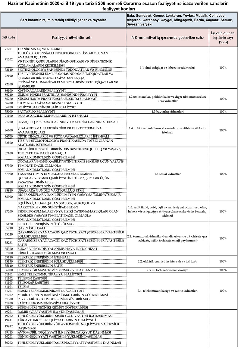 Qeyd edək ki, Azərbaycan Respublikası Nazirlər Kabinetinin 2020-ci il 19 iyun tarixli 208 nömrəli Qərarının 1.3-cü bəndinə əsasən, bu Qərarın əlavəsində nəzərdə tutulmuş sahələrdə fəaliyyət göstərən özəl hüquqi şəxslərin əməkdaşlarının və hüquqi şəxs yaratmadan sahibkarlıq fəaliyyəti ilə məşğul olan fiziki şəxslərin və onların işçilərinin, fəaliyyətinin davam etdirilməsinə icazə verilməmiş özəl hüquqi şəxslərin mühafizəsi və texniki təhlükəsizliyinin təmin edilməsi üçün tələb olunan əməkdaşların işə çıxmasına onlar barəsində məlumatlar işəgötürən tərəfindən gücləndirilmiş elektron imza vasitəsilə “icaze.e-gov.az” portalına daxil edildikdən sonra yol verilir.