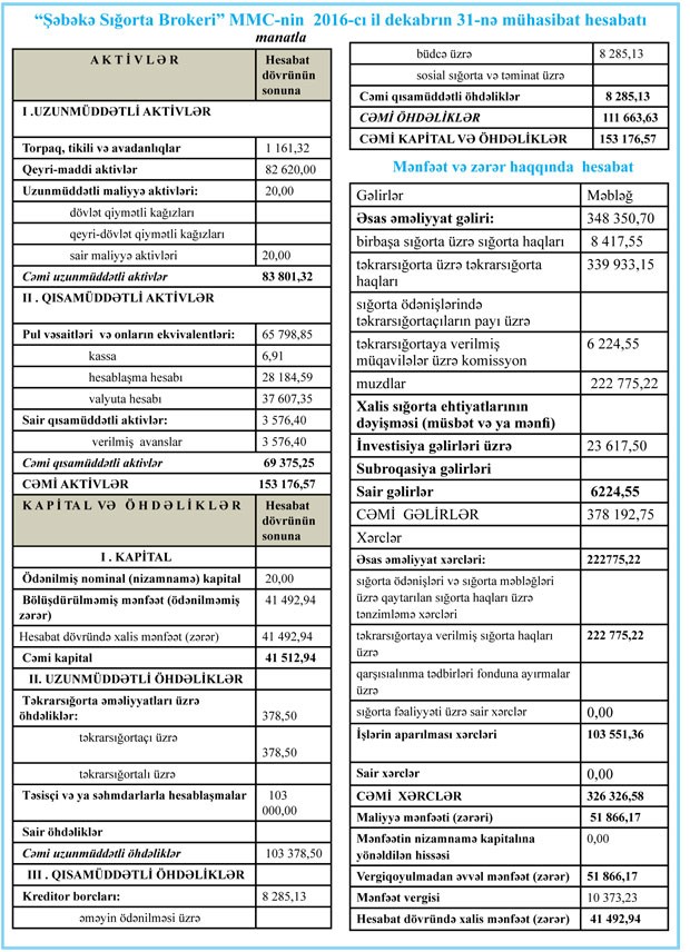 “Şəbəkə Sığorta Brokeri” MMC 2016-cı ili 41 492 manat xalis mənfəət ilə başa vurub.