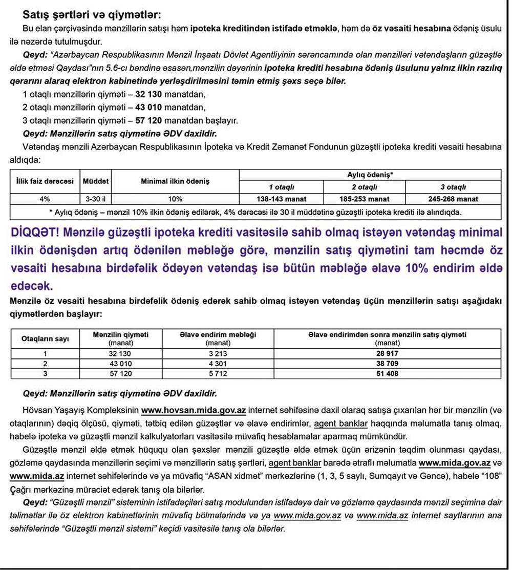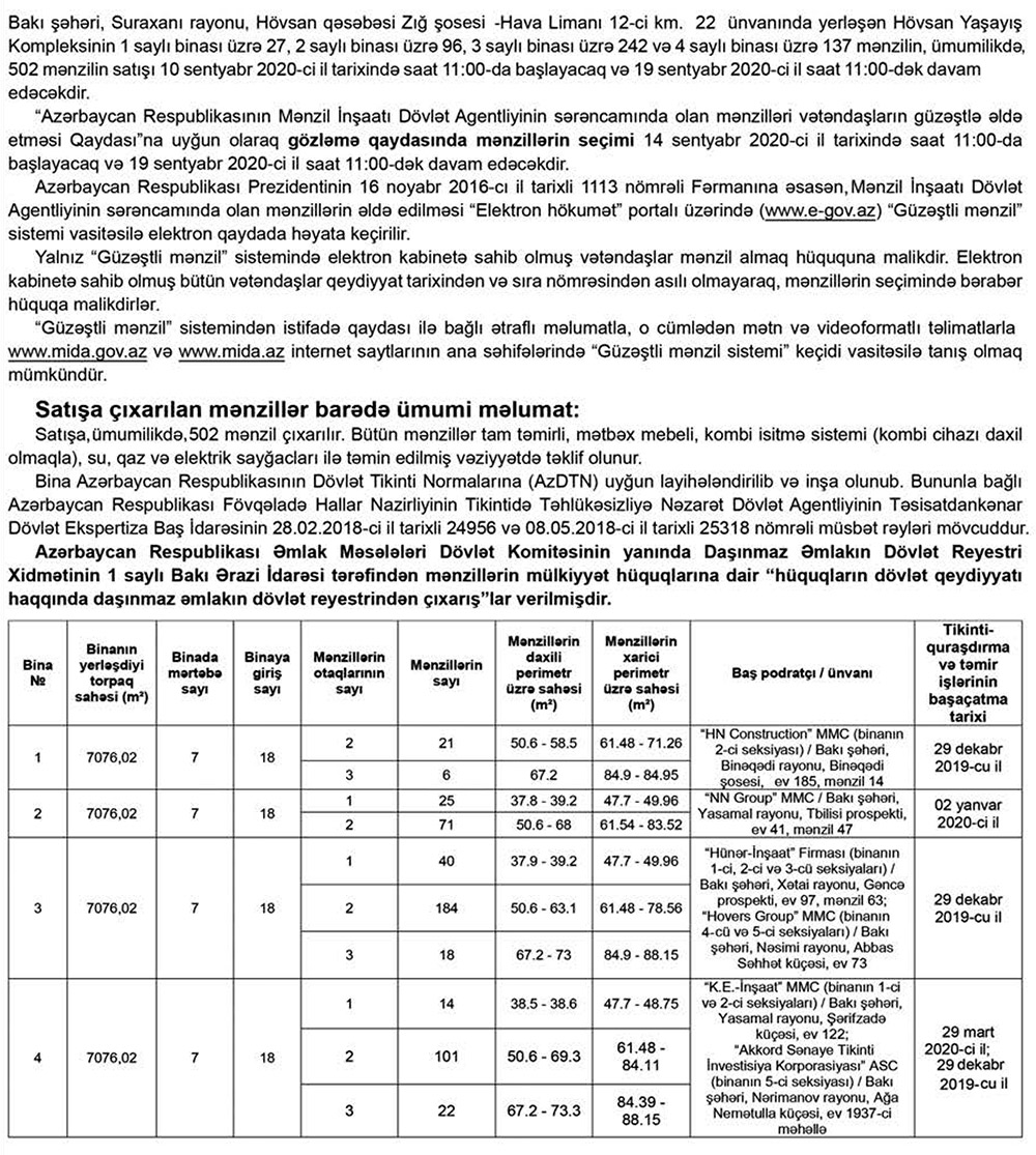 Azərbaycan Respublikasının Mənzil İnşaat Dövlət Agentliyinin növbəti layihəsi – Hövsan Yaşayış Kompleksində mənzillərin güzəştlə satışı barədə elan