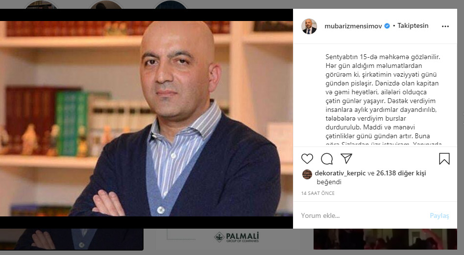 "Sentyabtın 15-də məhkəmə gözlənilir. Hər gün aldığım məlumatlardan görürəm ki, şirkətimin vəziyyəti günü-gündən pisləşir. Dənizdə olan kapitan və gəmi heyətləri, ailələri olduqca çətin günlər yaşayır. Dəstək verdiyim insanlara aylıq yardımlar dayandırılıb, tələbələrə verdiyim burslar durdurulub. Maddi və mənəvi çətinliklər günü-gündən artır. Buna görə Sizlərdən üzr istəyirəm. Yanınızda ola, dəstək verə bilmirəm“, - iş adamı yazıb.