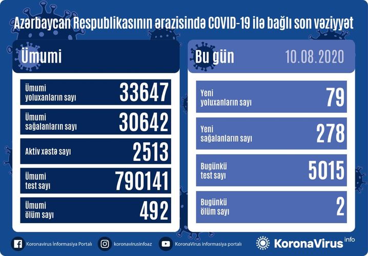 Son 24 saatda Azərbaycan Respublikasında koronavirus (COVID-19) infeksiyasına 79 yeni yoluxma faktı qeydə alınıb, 278 nəfər müalicə olunaraq sağalıb və evə buraxılıb.