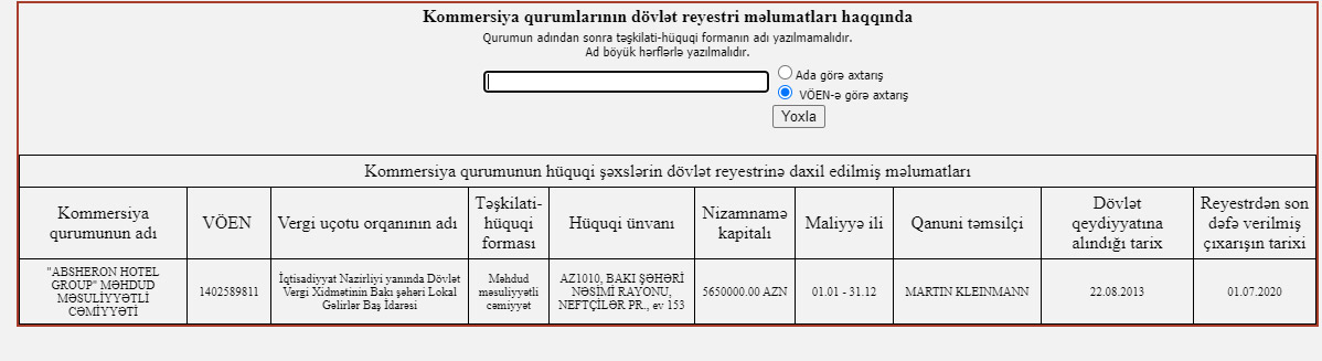 İqtisadiyyat Nazirliyi yanında Dövlət Vergi Xidməti "Absheron Hotel Group" MMC-nin nizamnamə kapitalına 2 milyon manatlıq əlavəni qeydə alıb.