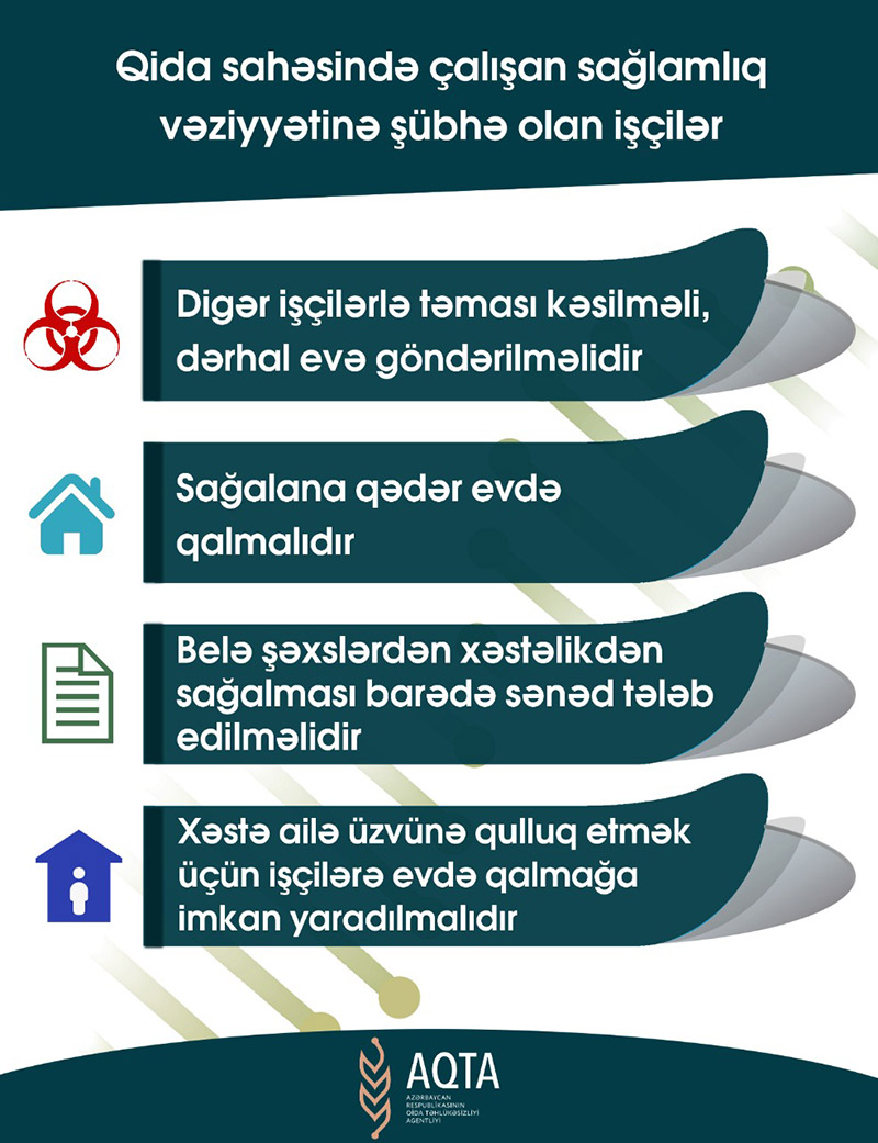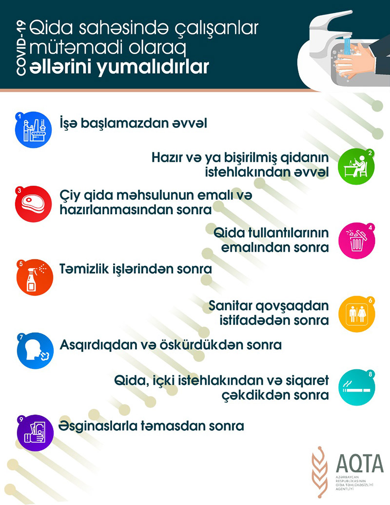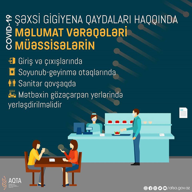 Azərbaycan Qida Təhlükəsizliyi Agentliyi (AQTA) insanların sıx toplaşmasının xəstəliyin yayılma intensivliyinə birbaşa təsirini nəzərə alaraq, ictimai iaşə müəssisələrində (restoran və kafelər) bir sıra qaydalara əməl etməli olduqları qaydalarla bağlı növbədi dəfə açıqlama yayıb.