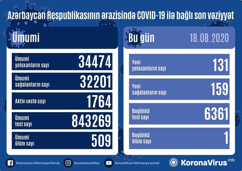 Son 24 saatda Azərbaycanda koronavirus (COVID-19) infeksiyasına 131 yeni yoluxma faktı qeydə alınıb, 159 nəfər müalicə olunaraq sağalıb və evə buraxılıb.