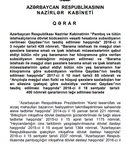 Marja xəbər verir ki, Qərar ilə, “Pambıq və tütün istehsalçılarına dövlət büdcəsinin vəsaiti hesabına subsidiyanın verilməsi Qaydası”nın təsdiq edilməsi haqqında” Azərbaycan Respublikası Nazirlər Kabinetinin 2016-cı il 3 noyabr tarixli 439 nömrəli Qərarı, “Barama istehsalı ilə məşğul olan şəxslərə barama emalı və ipək istehsalı müəssisələrinin qəbul etdiyi bütün növ yaş baramanın hər kiloqramına görə verilən subsidiyanın məbləğinin müəyyən edilməsi və “Barama istehsalı ilə məşğul olan şəxslərə barama emalı və ipək istehsalı müəssisələrinin qəbul etdiyi bütün növ yaş baramanın hər kiloqramına görə subsidiyanın verilmə Qaydası”nın təsdiq edilməsi haqqında” Azərbaycan Respublikası Nazirlər Kabinetinin 2017-ci il 10 mart tarixli 85 nömrəli Qərarı və “Arıçılıqla məşğul olan fiziki və hüquqi şəxslərə saxladıqları hər arı ailəsinə (pətəyə) görə subsidiya verilməsi Qaydası”nın təsdiq edilməsi haqqında” Azərbaycan Respublikası Nazirlər Kabinetinin 2018-ci il 18 sentyabr tarixli 400 nömrəli Qərarı ləğv edilib.