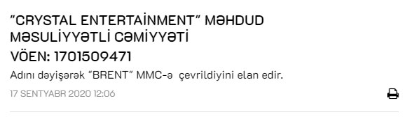 "Crystal Entertainment" MMC adını dəyişərək "BRENT" MMC-yə çevrildiyini elan edib.