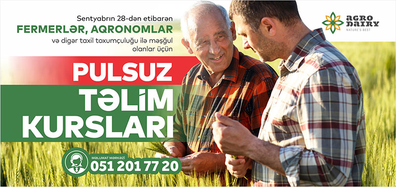 “Aqro Dairy” MMC, şirkətin Hacıqabul rayonunda yerləşən ofis binasında zəruri işləri yerinə yetirməklə, 28 sentyabr 2020-ci il tarixindən fermerlər, aqronomlar, toxumçuluqla məşğul olanlar və digər maraq göstərənlər üçün ödənişsiz təlimlərin təşkilinə başlayacaq.