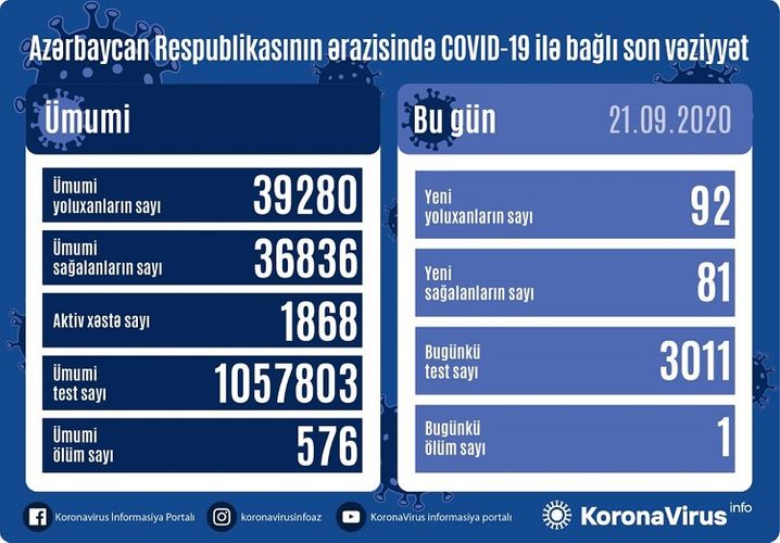 Azərbaycan Respublikasında koronavirus (COVID-19) infeksiyasına 92 yeni yoluxma faktı qeydə alınıb, 81 nəfər müalicə olunaraq sağalıb və evə buraxılıb.