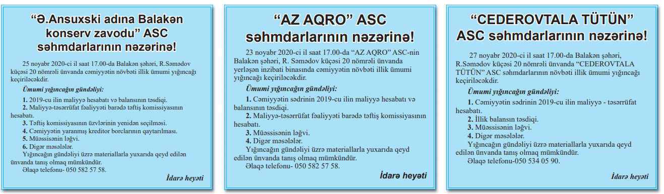 Marja xəbər verir ki 23-27 Noyabr 2020-ci il tarixlərində hər 3 ASC səhmdarlarınınnövbəti illik ümumi yığıncağı keçiriləcəkdir. Yığıncaq Balakən şəhəri, R, Səmədov küç 20 nömrəli ünvanda keçiriləcəkdir.