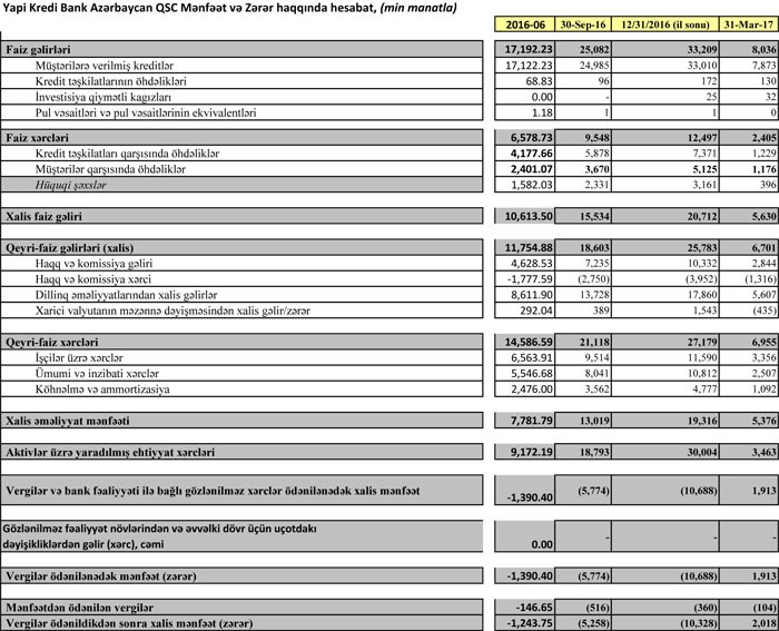Yapı Kredi Bank Azərbaycan 2017-ci ilin 1-cü rübünü 2 milyon 18 min manat xalis mənfəət ilə başa vurub.