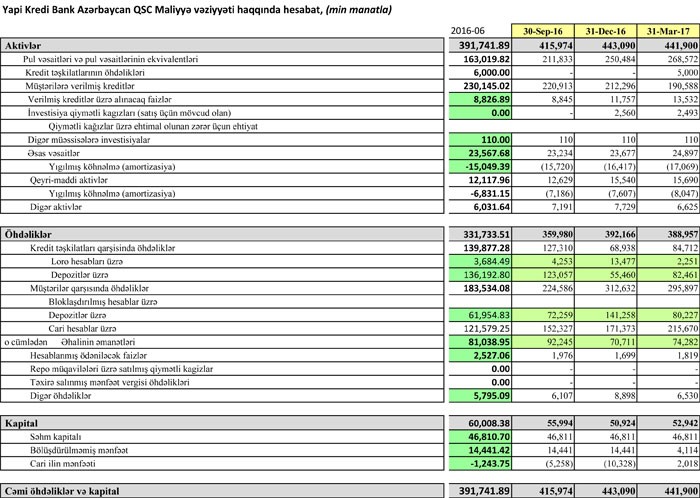 Yapı Kredi Bank Azərbaycan 31 Mart 2017-ci il tarixinə 441 milyon 900 min manat cəmi aktivlərə, 388 milyon 957 min manat cəmi öhdəliklərə və 52 milyon 942 min manat cəmi kapitala malik olub. Bank ötən ilin sonunda 443 milyon 90 min manat cəmi aktivlərə, 392 milyon 166 min manat cəmi öhdəliklərə və 50 milyon 924 min manat cəmi kapitala malik idi. Bankın cəmi aktivləri əsasən müştərilərə verilən kredtlərin 212 milyon 296 min manatdan 190 milyon 588 min manata geriləməsilə əlaqədar azalmışdır.
