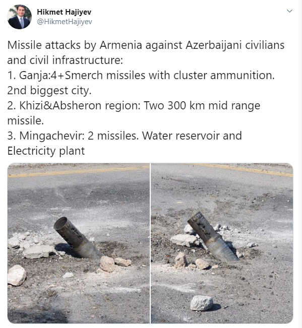 Bu gün Ermənistanın Azərbaycan mülki şəxslərinə və mülki infrastrukturuna qarşı raket hücumları barədə Prezidentin köməkçisi Hikmət Hacıyev tvit yazıb.