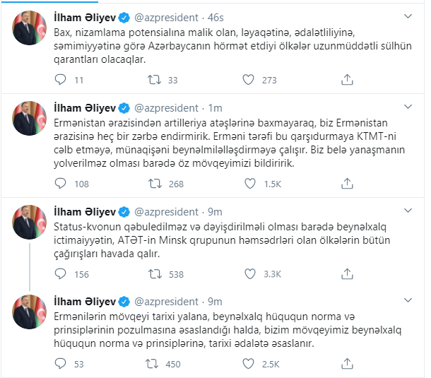 “Status-kvonun qəbuledilməz və dəyişdirilməli olması barədə beynəlxalq ictimaiyyətin, ATƏT-in Minsk qrupunun həmsədrləri olan ölkələrin bütün çağırışları havada qalır”.