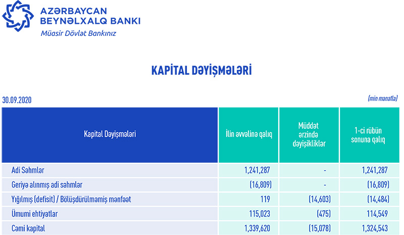 30 sentyabr 2020-ci il tarixində  “Azərbaycan Beynəlxaıq Bankı” 1 milyard 112 milyon 509 min manat məcmu kapitala malik olub.
