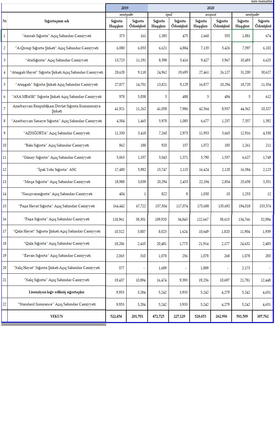 Hesabat dövründə sığorta şirkətlərinin həyata keçirdikləri ödənişlərin məbləği isə 307 milyon 762 milyon manat təşkil edib. Bu isə illik müqayisədə 52,6% çoxdur.