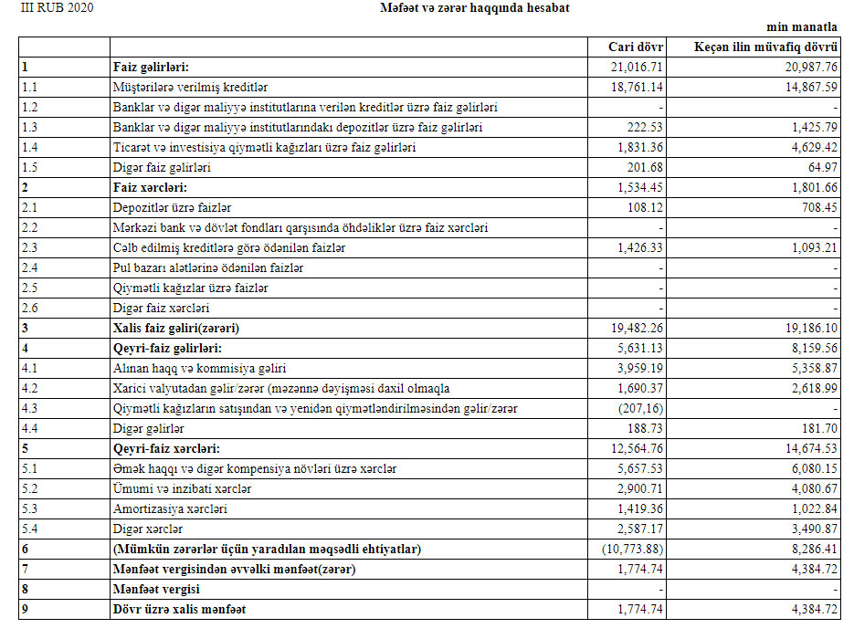 Müqayisə üçün qeyd edək ki, 2019-cu ilin 9 ayında AFB Bankın cəmi əməliyyat gəlirləri 29 milyon 147 min manat, cəmi əməliyyyat xərcləri 16 milyon 476 min manat, əməliyyat mənfəəti 12 milyon 681 min manat təşkil etmişdi. Bank əməliyyat mənfəətinin 8 milyon 286 min manatını mümkün zərərlər üçün yaradılan məqsədli ehtiyatlara ayırmış və həmin dövrü 4 milyon 384 min manat xalis mənfəət ilə bağlamışdı.