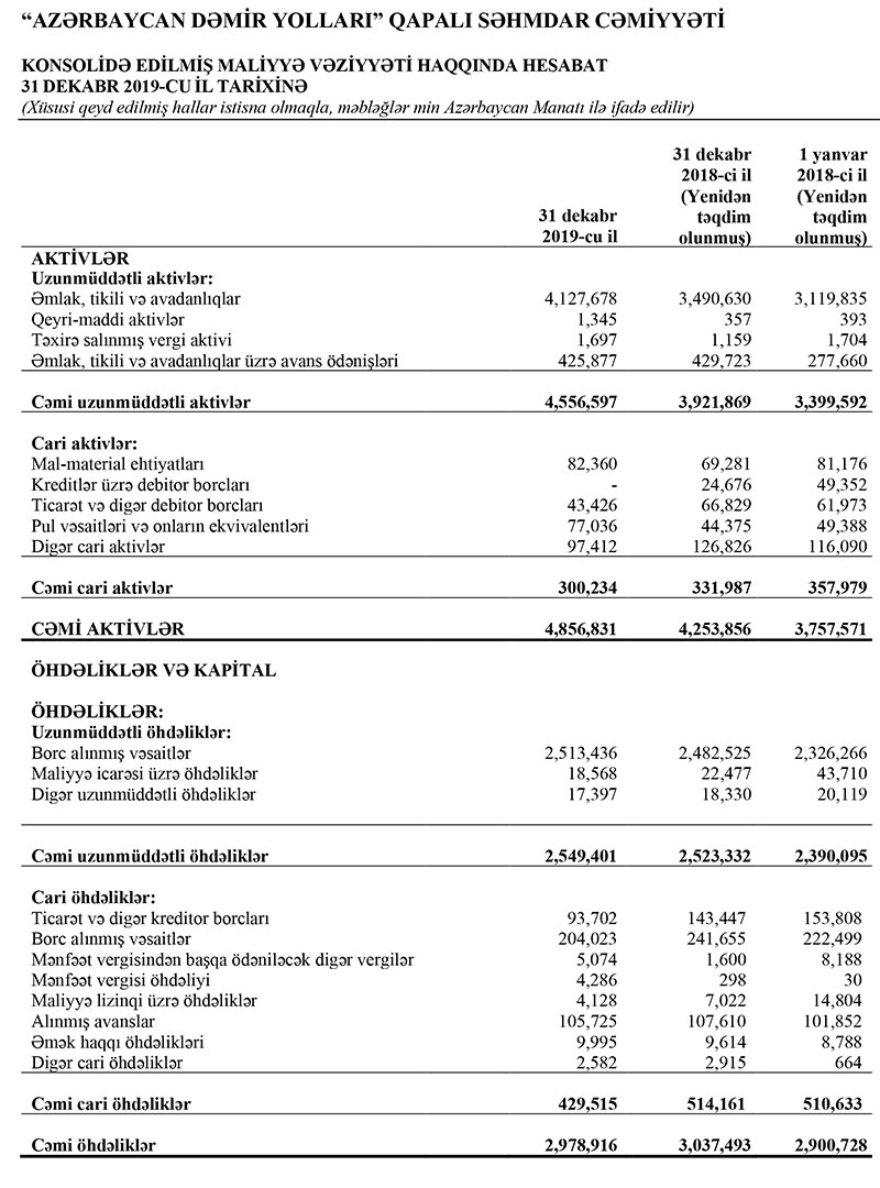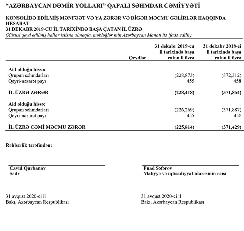 “Azərbaycan Dəmir Yolları” QSC 2019-cu ili 228 milyon 418 min manat zərərlə başa vurub.