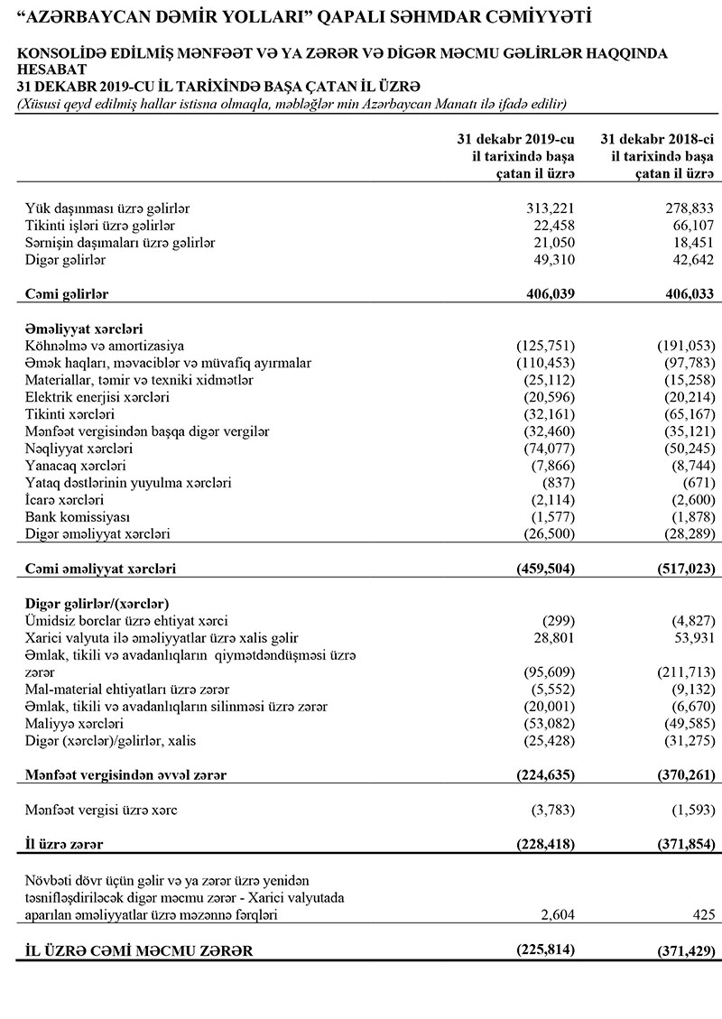 Ötən il "Azərbaycan Dəmir Yolları"nın cəmi əməliyyat gəlirlərinin 6 min manat artaraq 406 milyon 39 min manat təşkil etməsinə qarşı cəmi əməliyyat xərcləri 57 milyon 519 min manat azalaraq 459 milyon 504 min manat təşkil edib.