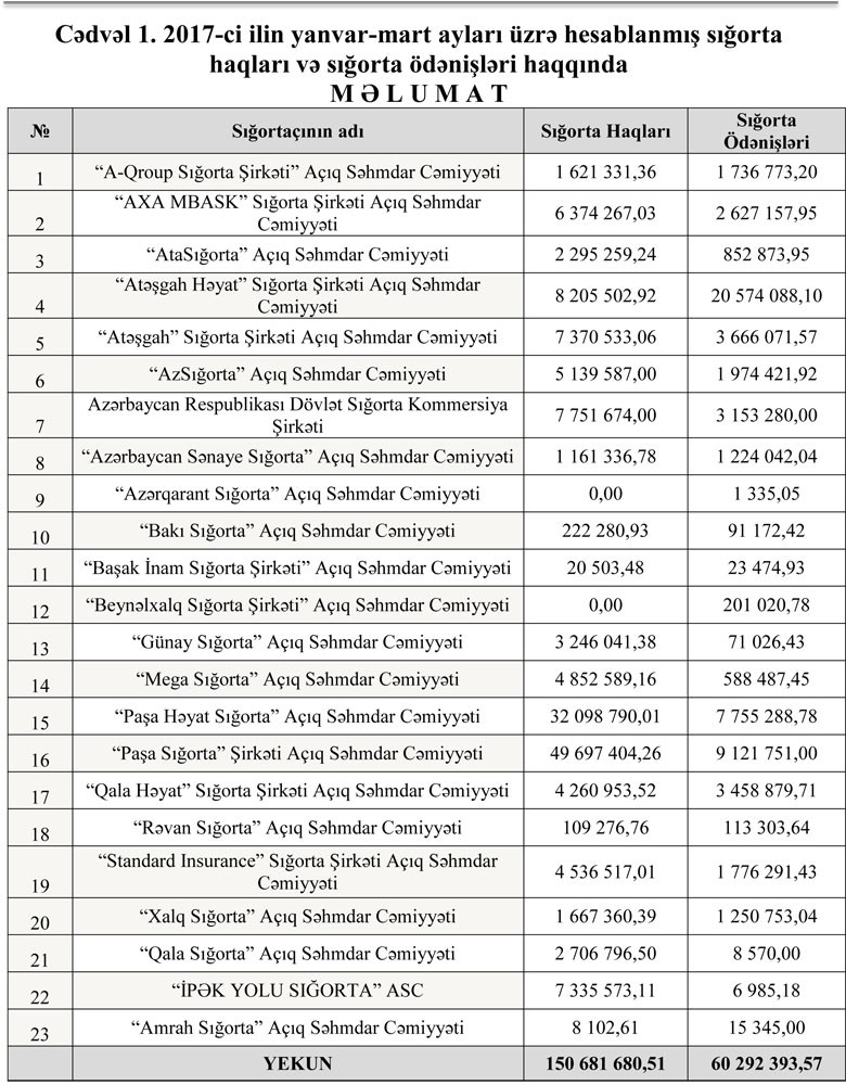 Qeyd edək ki, 2016-cı ilin ilk rübü ərzində sığorta şirkətləri tərəfindən 152 milyon 394 min manat sığorta haqları hesablanmış, 52 milyon 578 min manat ödənişlər həyata keçirilmişdi. Beləliklə, sığortada yığımlar azalır, ödənişlər artır.